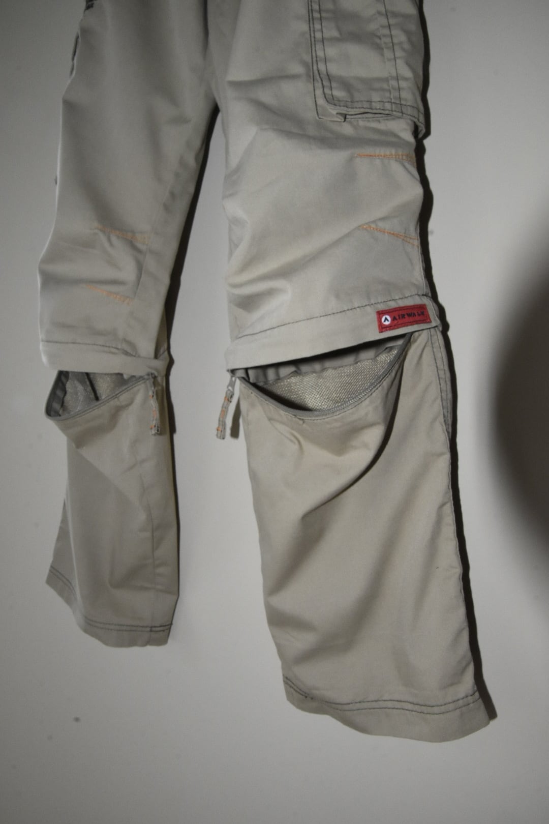 ポケットの配置や、膝下で切り替えられるジップのディテールが、ワークとユーティリティを掛け合わせたバランス。やや長めのレングスがスニーカーに自然にたまって、抜け感を生むのもポイント。